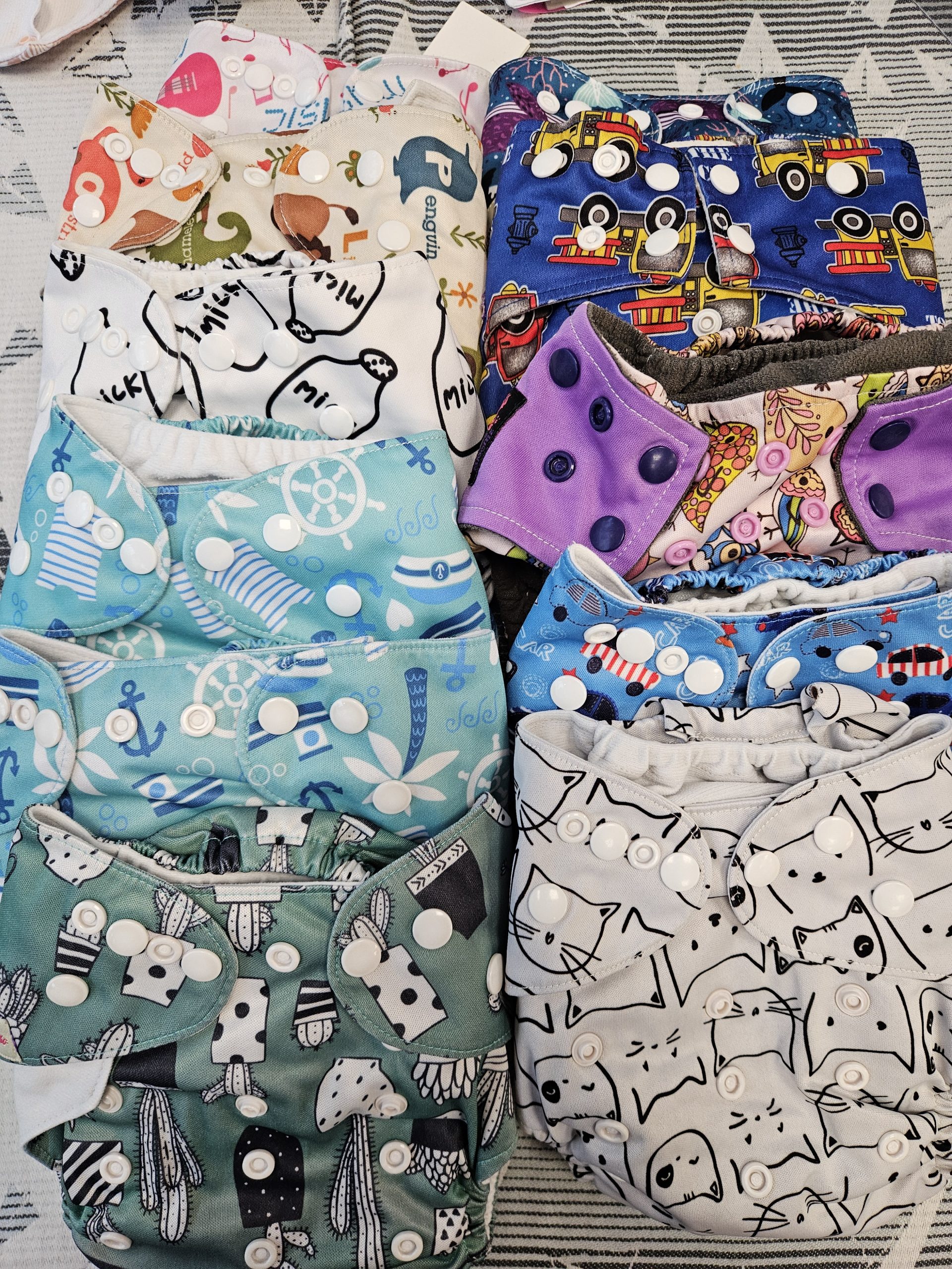 Pocket nappies by Littles and Bloomz single pocket nappies with popper fastening.